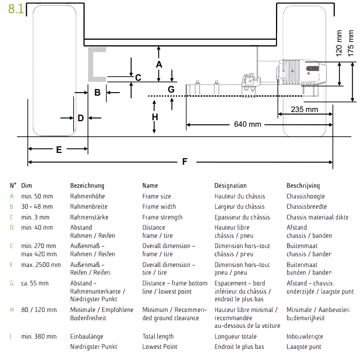 De inbouwhoogte is 12,00 cm. Bij montage op een geschikt chassis bedraagt het verlies aan bodemvrijheid 5,70 cm. De inbouwlengte van de mover is 35,00 cm. De metaaldelen zijn gegalvaniseerd. De mover is optimaal beschermd tegen vocht, waardoor de kans op storingen ook bij montage achter de wielen minimaal is. De aandrijfmotor heeft 2 Koolborstels. Deze mover is geïntroduceerd in 2025.